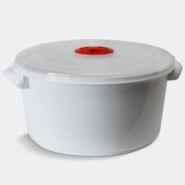 Contenedor plástico para cocinar o calentar en microondas. Tapa con válvula de aireación que deja salir el vapor durante la cocción. Práctico, además, para hacer pochoclos.