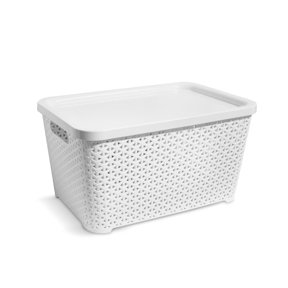 Cesto plástico simil ratán mediano de terminación mate y tapa de terminación brillante. Con agarres laterales. Apilables. Capacidad: 20 Lts.