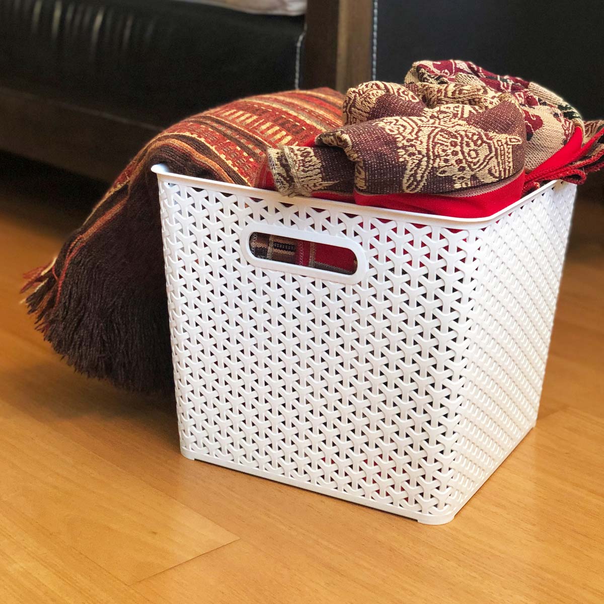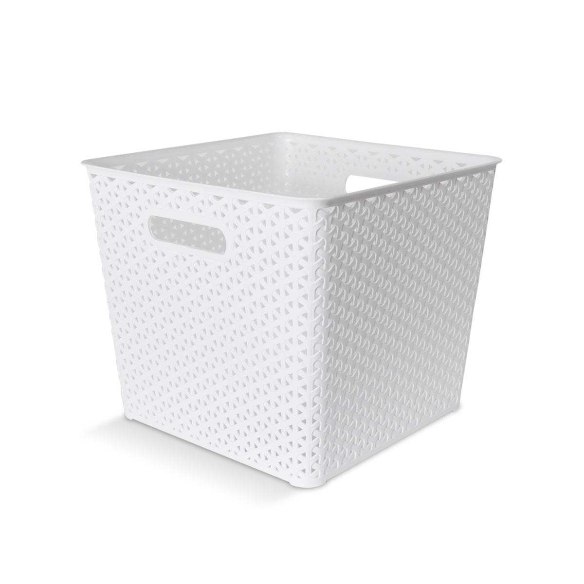 Cesto plástico simil ratán cuadrado de terminación mate. Con agarres laterales.