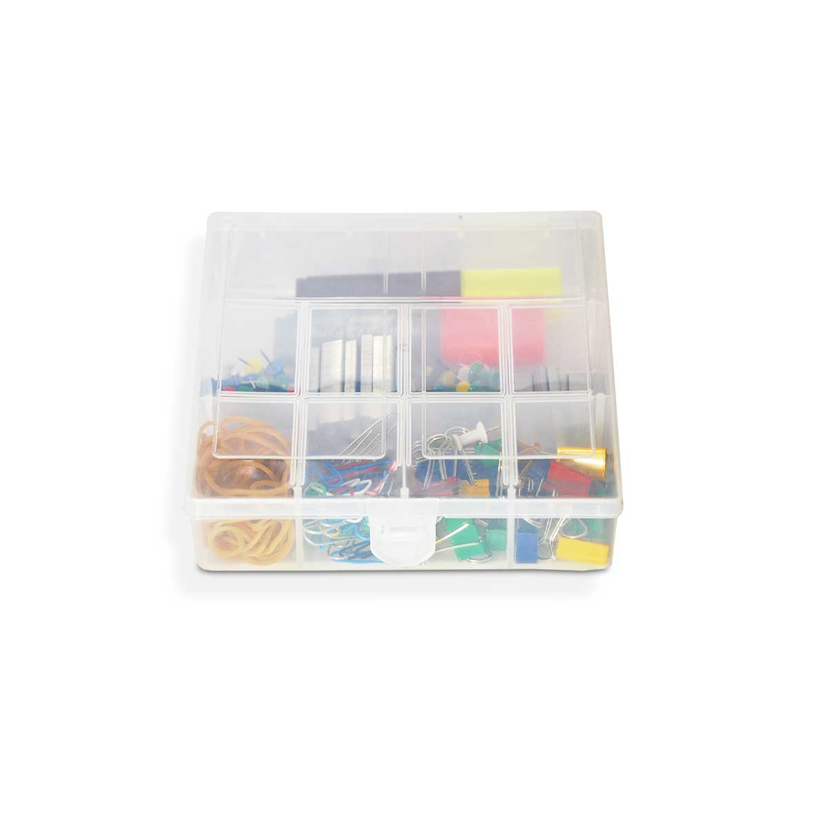 Organizador cuadrado con múltiples divisiones, tapa y traba.
