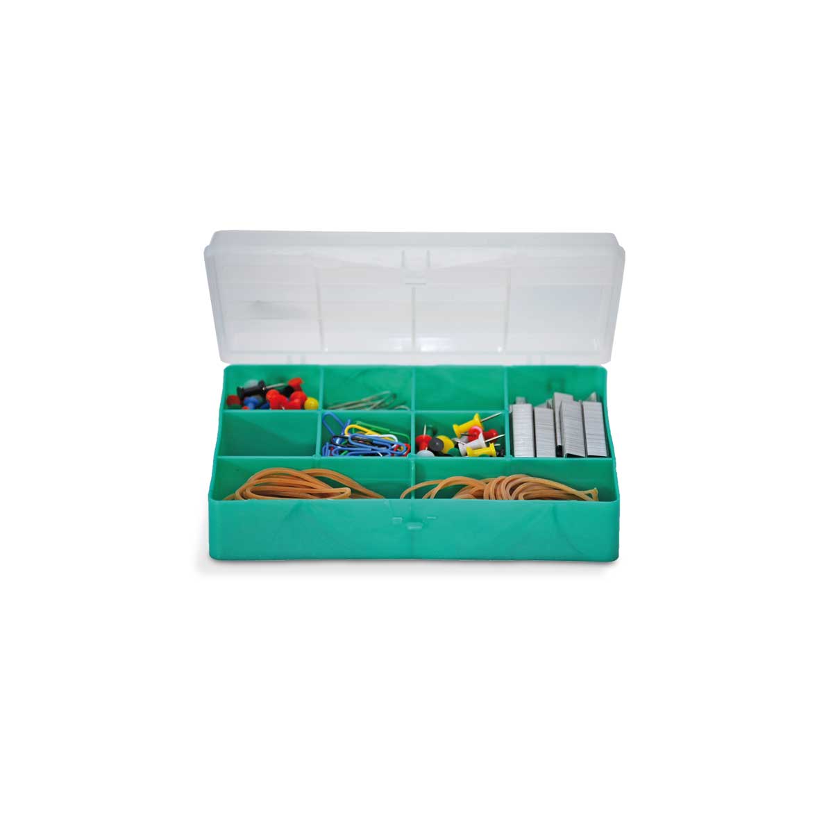 Organizador con múltiples divisiones, tapa y traba, tamaño chico.