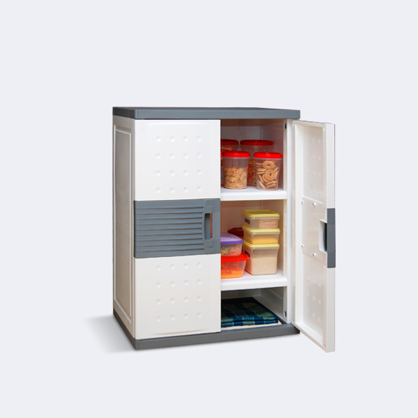 Armario bajo con puertas bicolor, capacidad 20 kg por estante. Rápido ensamble, armado sin herramientas.