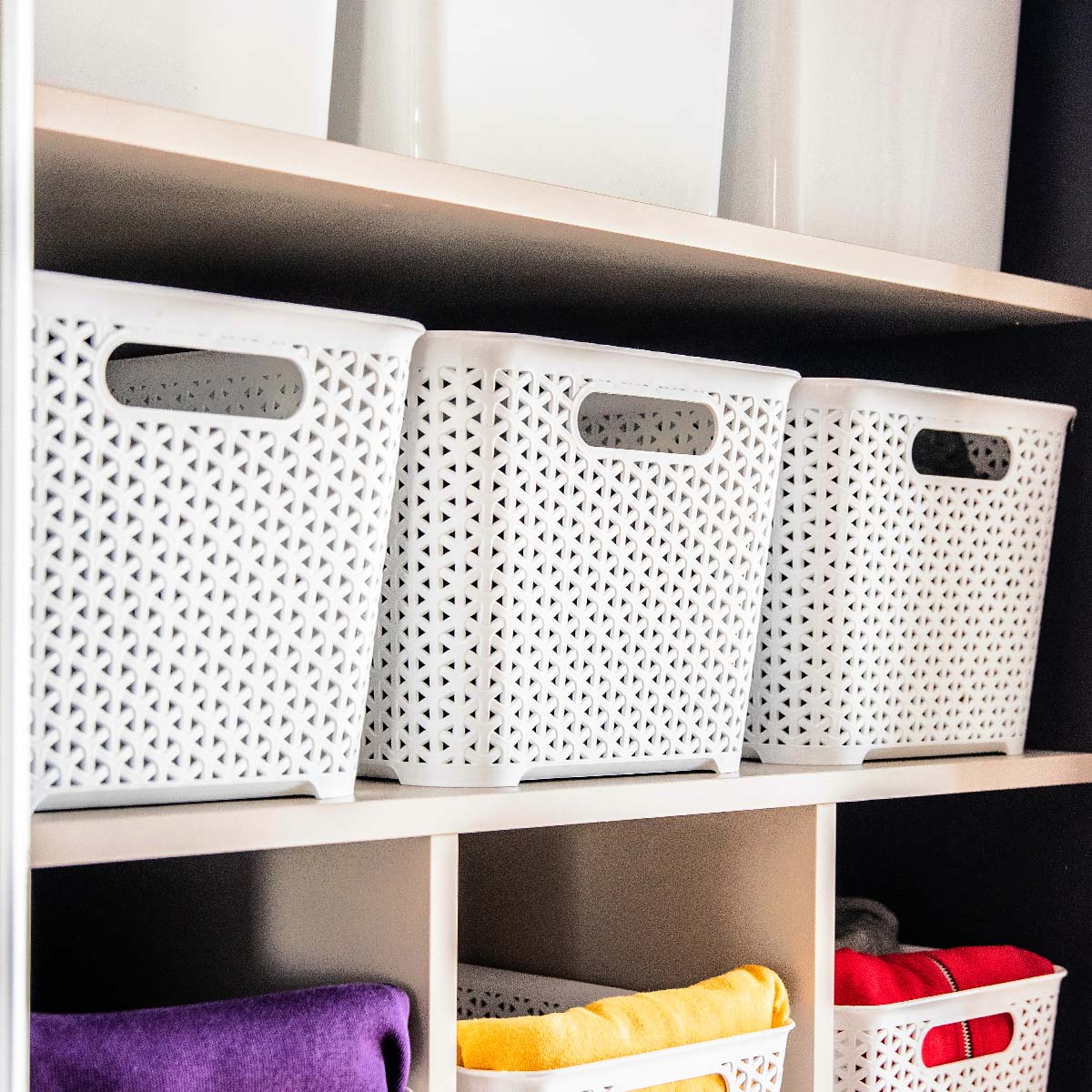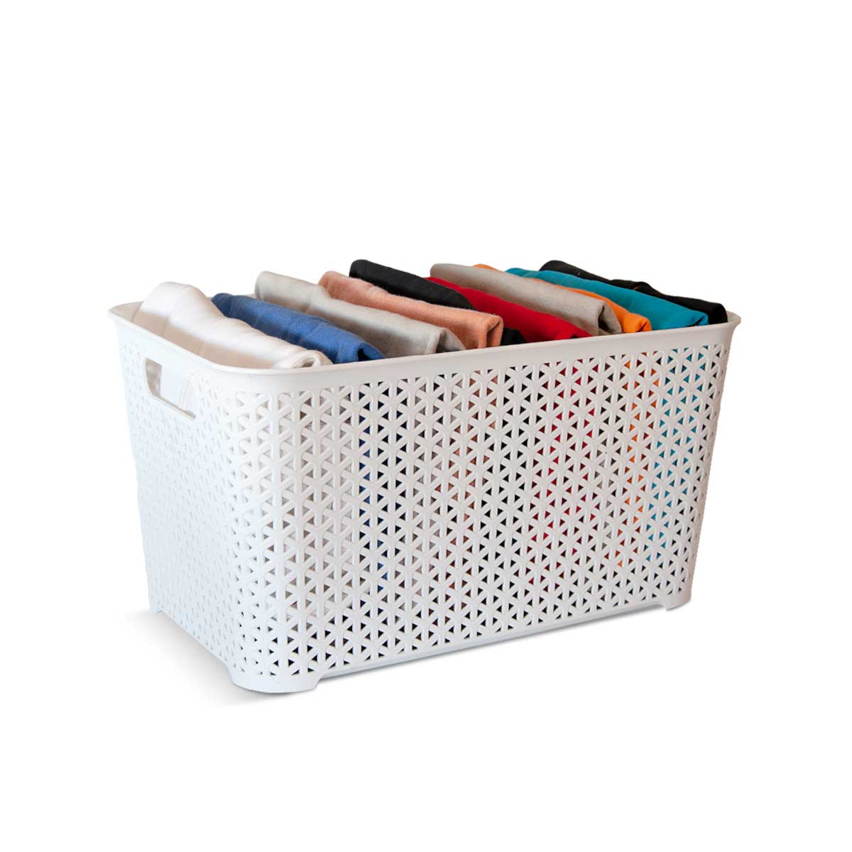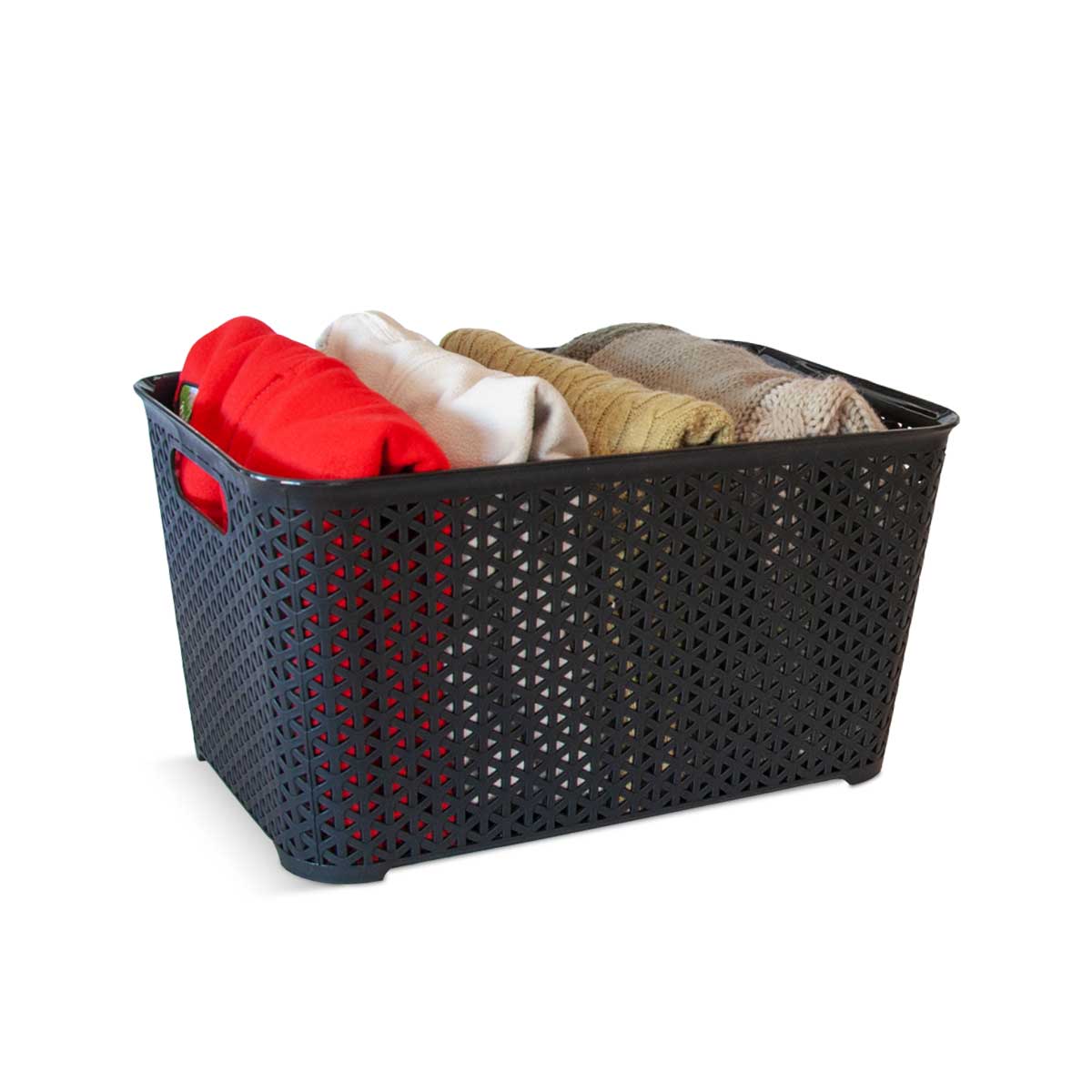 Cesto plástico simil ratán mediano de terminación mate. Con agarres laterales. Capacidad: 20 Lts.