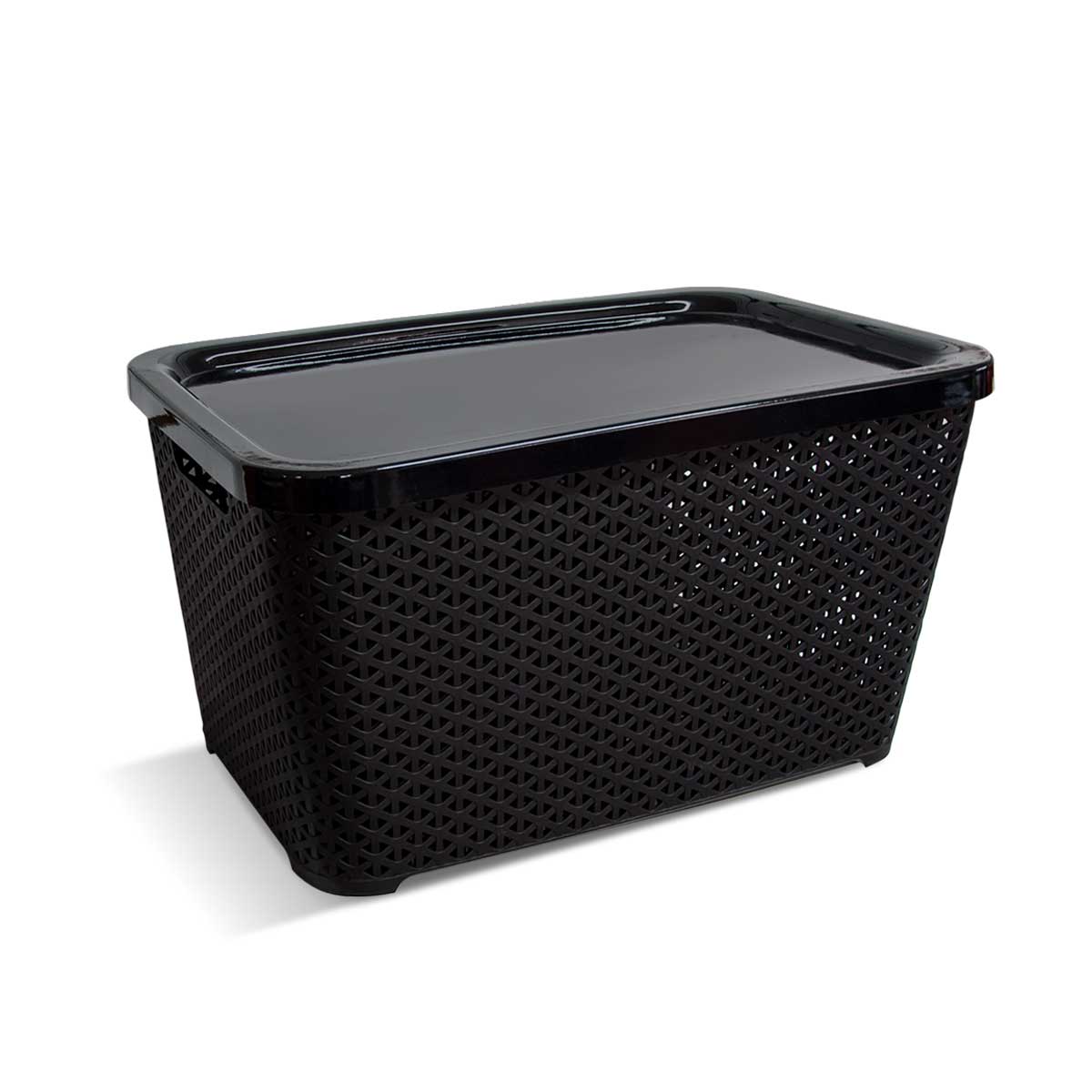 Cesto plástico simil ratán grande de terminación mate y tapa de terminación brillante. Con agarres laterales. Apilables. Capacidad: 40 Lts.