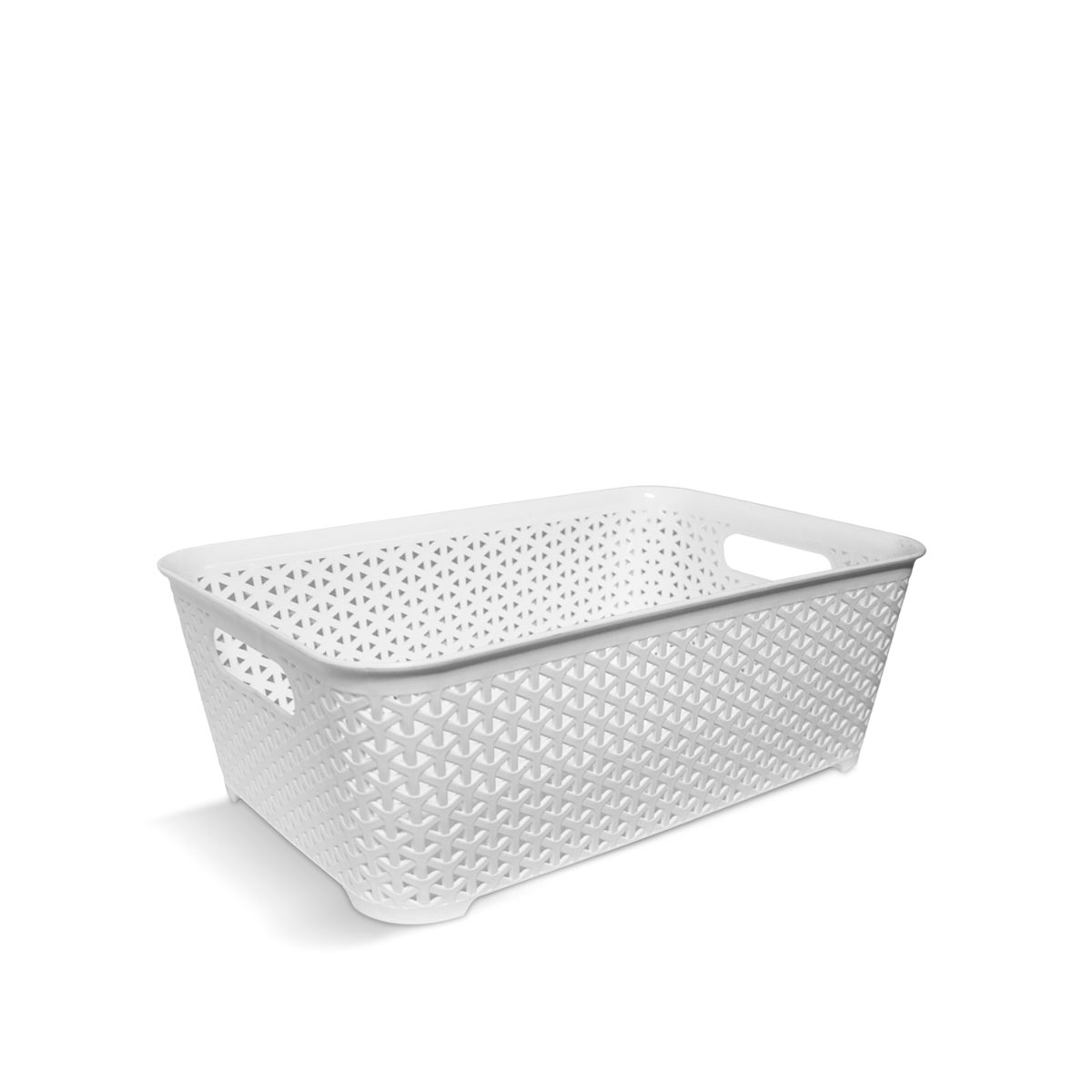 Cesto plástico simil ratán mediano bajo de terminación mate. Con agarres laterales.
